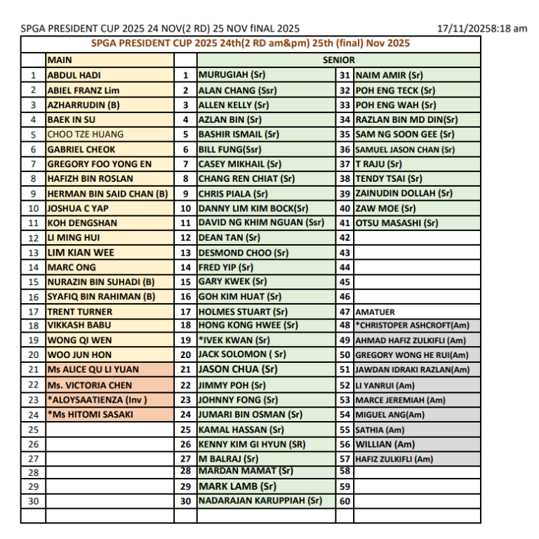 News Breakthrough ADT victory for Leow December 1, 2025 Read More Gregory Foo claims 2025 President Cup title November 26, 2025 Read More 2025 President Cup Entry List November 17, 2025 Read More SPGA President Cup 2025 November 8, 2025 Read More Nov 2025 Pro Test November 7, 2025 Read More Leow wins with late charge at Laguna National August 27, 2025 Read More 1 2 3 4 5 6 7 8 Next »